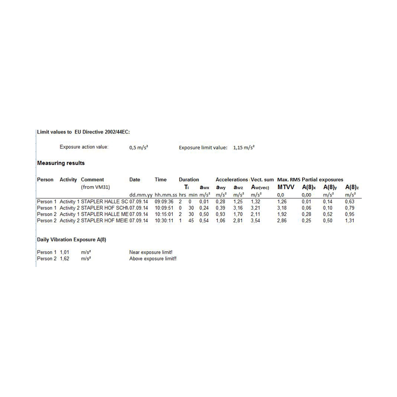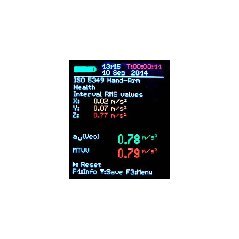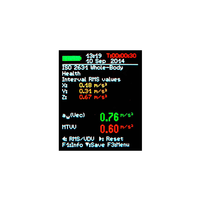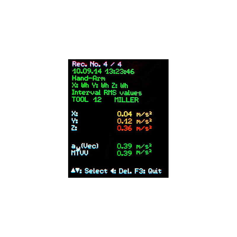 Display of running and interval RMS value (RMS), maximum RMS value (MTVV), vibration dose value (VDV), vibration total value, peak value, and maximum peak value.