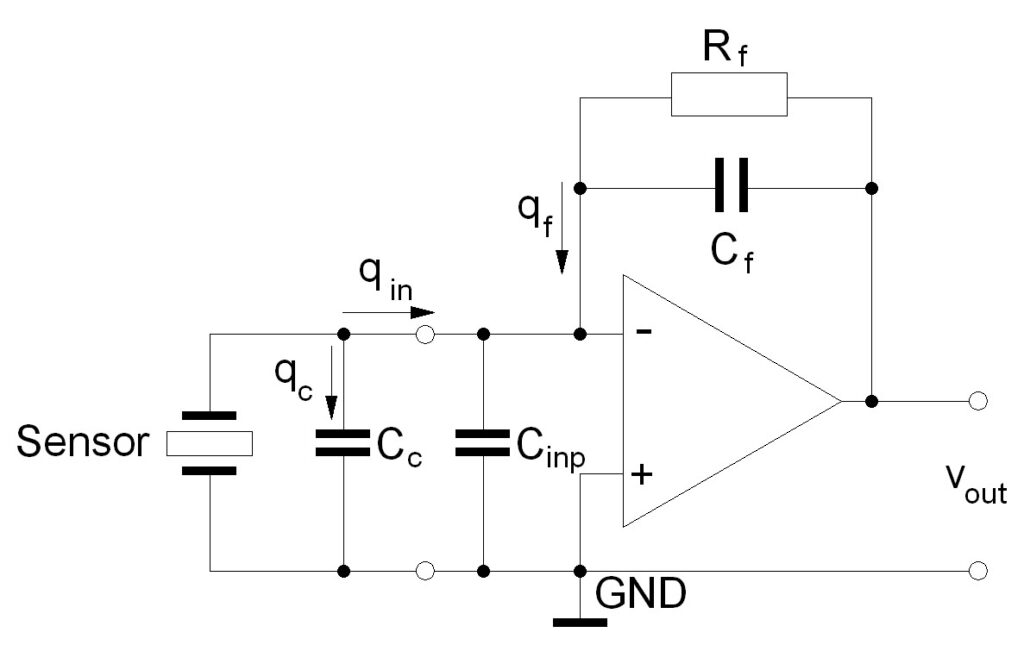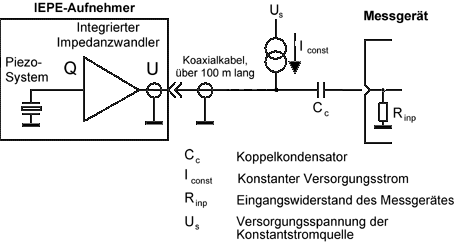 6. MesstechnikAufnehmer mit LadungsausgangSensoren mit Ladungsausgang weisen einige Besonderheiten im Vergleich zu anderen Sensoren auf, deren Beachtung unbedingt erforderlich ist, um exakte Messergebisse zu erhalten:Verwenden Sie immer störarme („low noise“) Kabel. Die Kabellänge sollte nicht über 10 m betragen. Das Kabel sollte so verlegt werden, dass es beim Messen nicht bewegt wird. Alle Steckverbindungen müssen fest angezogen sein.Vorzugsweise sollten Ladungsverstärker zur Signalverarbeitung eingesetzt werden. Alternativ sind auch Wechselspannungsverstärker mit hochohmigem Eingang geeignet. Beide Prinzipien werden im Folgenden erläutert.LadungsverstärkerAufnehmer mit Ladungsausgang erzeugen ein Ausgangssignal in der Größenordnung von einigen Picocoulomb (1pC=1000fC) mit einer sehr hohen Ausgangsimpedanz. Um Standardmesstechnik zur Weiterverarbeitung nutzen zu können, muss es in ein niederimpedantes Signal umgewandelt werden.Zu diesem Zweck setzt man vorzugsweise Ladungsverstärker ein. Deren Eingangsstufe besteht aus einem kapazitiv rückgekoppelten Differenzverstärker. Das Ladungssignal am Eingang wird durch das rückgekoppelte Ladungssignal kompensiert. Die am Ausgang anliegende Spannung ist ein Maß für die eingespeiste Ladung. Die Abbildung zeigt schematisch den Aufbau einer solchen Ladungsverstärkerstufe:Die Eingangsladung qin liegt am Summenpunkt, dem invertierenden Eingang des Differenzverstärkers. Diese Ladung verteilt sich auf die Kabelkapazität Cc, die Eingangskapazität des Verstärkers Cinp und den Rückkoppelkondensator Cf. Die Knotengleichung für den Eingang lautet demzufolge:Unter Verwendung der elektrostatischen Gleichung:und Ersetzen von qc, qinp und qf erhält man:Da die Spannungsdifferenz am Eingang eines Differenzverstärkers unter normalen Betriebsbedingungen Null wird, kann man davon ausgehen, dass die Eingangsspannung uinp gleich Massepotenzial (GND) ist. Mit uinp=0 lässt sich die Gleichung wie folgt vereinfachen:und nach der Ausgangsspannung uout auflösen:Das Ergebnis zeigt, dass die Ausgangsspannung eines Ladungsverstärkers lediglich von der eingespeisten Ladung und der Rückkoppelkapazität abhängt. Eingangs- und Kabelkapazitäten bleiben ohne Einfluss. Dies ist interessant zu wissen, wenn ein Beschleunigungsaufnehmer mit unterschiedlichen Kabeln eingesetzt wird.Der Rückkoppelwiderstand Rf hat die Aufgabe, den Verstärker gleichspannungsmäßig zu stabilisieren und den Ausgang driftfrei zu machen. Gleichzeitig bestimmt Rf die untere Grenzfrequenz des Verstärkers.Die gezeigte Prinzipschaltung stellt nur die Eingangsstufe eines üblichen Ladungsverstärkers dar. Weitere Stufen, wie Spannungsverstärker, Filter und Integratoren, sind nicht gezeigtTypische Ladungsverstärker sind zum Beispiel die Geräte der Reihe M72 oder der Ladungsvorverstärker IEPE100 von Metra.Wechselspannungsverstärker mit hoher EingangsimpedanzAnstelle von Ladungsverstärkern eignen sich für Ladungsaufnehmer auch Wechselspannungsverstärker mit sehr hoher Eingangsimpedanz. Im Gegensatz zum Ladungsverstärker müssen in diesem Fall jedoch die Kapazitäten von Sensor, Kabel und Verstärkereingang berücksichtigt werden (Bild).Der Spannungsübertragungsfaktor Bua eines Sensors mit bekanntem Ladungsübertragungsfaktor Bqa und der Innenkapazität Ci kann nach folgender Formel berechnet werden:Die Werte für Bqa und Ci findet man im Datenblatt.Berücksichtigt man die Kapazität des verwendeten Sensorkabels Cc und die Eingangskapazität des Spannungsverstärkers Cinp, ergibt sich der korrigierte Spannungsübertragungsfaktor B´ua wie folgt:Der korrigierte Spannungsübertragungsfaktor B´ua ist kleiner als Bua. Ein typisches Anschlusskabel vom Typ 009 mit 1,5 m Länge hat eine Kapazität von ca. 135 pF.Die untere Grenzfrequenz fl wird von Cc, Cinp und Rinp bestimmt:Die untere Grenzfrequenz steigt mit sinkendem Verstärkereingangswiderstand.Beispiel: An einen typischen Oszilloskopeingang mit 10MOhm Eingangswiderstand und 20pF Eingangskapazität soll ein Beschleunigungsaufnehmer vom Typ KS56 mit einer Innenkapazität von 370 pF angeschlossen werden. Das Sensorkabel vom Typ 009 hat eine Kapazität von 135 pF.Ergebnis: Die untere Grenzfrequenz ist ca. 30 Hz.IEPE-AufnehmerDie Besonderheit IEPE-kompatibler Sensoren liegt in der Übertragung von Messsignal und Versorgungsenergie über ein gemeinsames Kabel. Daher kommen Aufnehmer dieses Typs, ebenso wie Ladungsaufnehmer, mit nur einem massebezogenen Koaxialkabel aus. Die folgende Abbildung zeigt das Prinzip der IEPE-Versorgung.Der im Sensor integrierte Impedanzwandler oder Verstärker wird mit Konstantstrom zwischen 2 und 20 mA versorgt. Typisch ist ein Strom von 4 mA. Einige batteriebetriebene Geräte arbeiten auch mit 1 mA Konstantstrom.Der Konstantstrom Iconst wird in das Signalkabel eingespeist.Die Höhe des Konstantstromes und die Kabellänge können unter Umständen die obere Grenzfrequenz beeinflussen.Der Entkoppelkondensator Cc hält Gleichspannungsanteile vom nachfolgenden Messgerät fern. Die RC-Kombination aus Cc und Rinp wirkt als Hochpassfilter. Die Zeitkonstante muss ausreichend hoch dimensioniert sein, um alle relevanten Signalanteile durchzulassen.Wichtig:An einen IEPE-kompatiblen Aufnehmer darf unter keinen Umständen eine Spannungsquelle ohne Strombegrenzung angeschlossen werden. Dies würde die Sensorelektronik sofort zerstören. Falschpolung des Sensorkabels kann ebenfalls zur Zerstörung der Elektronik führen.Aus nachfolgender Abbildung ist ersichtlich, dass IEPE-Beschleunigungsaufnehmer eine einfache Selbsttestmöglichkeit über ihre Arbeitspunktspannung haben.Aus der am Messgeräteeingang anliegenden Arbeitspunktspannung UBIAS lassen sich folgende Informationen über den Sensorzustand gewinnen:UBIAS < 2 V: Kurzschluss (bzw. negative Übersteuerung) 2 V < UBIAS < 18 V: O.K., Betrieb im Normalbereich UBIAS > 18 V: Messeingang offen, z.B. Kabelbruch oder Stecker locker