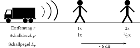Der Schalldruck folgt dem Abstandsgesetz, d.h. wie in folgendem Bild dargestellt, sinkt dieser bei Verdopplung des Abstandes vom der Schallquelle auf die Hälfte. Der Schallpegel reduziert um 6 dB.