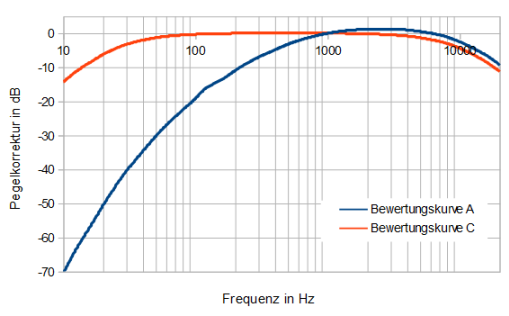 Das menschliche Gehör kann Frequenzen zwischen 16 Hz und 20 kHz wahrnehmen. Dabei werden allerdings gleiche Schalldrücke bei unterschiedlichen Frequenzen nicht gleich laut wahrgenommen. So ist ein Sinus-Ton mit 200 Hz nicht so laut wie mit 2000 Hz. Um diesen Effekt zu berücksichtigen, der Messtechnik also vozugeben wie ein menschliches Ohr hört, wird eine frequenzabhängige Pegelkorrektur vorgenommen. Die gebräuchlichste Korrektur ist das sogenannte A-Bewertungsfilter, welches niedrige Frequenzen stark dämpft. Es wird aber auch das C-Bewertungsfilter verwendet. Dieses ist über viele Frequenzordnungen konstant. Beide Pegelkorrekturen sind im nächsten Bild dargestellt.