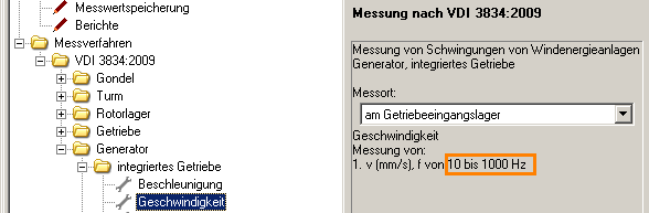 Sollen für die Abnahme von Windenergieanlagen mit Getriebe Schwingungsmessungen am Generator durchgeführt werden, sollen zum einen sehr niederfrequente Schwingungen, welche z.B. aus der Eiegenfrequenz des Turmes resultieren, aber auch sehr hohe Frequenzen, welche aus Wälzlagerschäden im Frühstadium entstehen, ausgeblendet werden. Dies wird mit einem Bandpass von 10 bis 1000 Hz erledigt. Die Amplituden von harmonischen Schwingungen mit Frequenzen von 10 bis 1000 Hz werden also erfasst, die Amplituden von Schwingungen aller anderen Frequenzen unterdrückt.