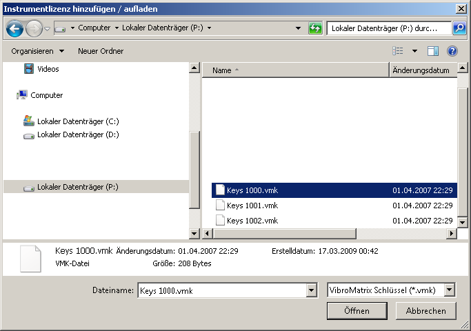 Beim Hinzufügen einer Lizenz öffnet sich ein Dateifenster. Hier ist die Schlüsseldatei zu wahlen und dann mit Öffnen zu bestätigen. Daraufhin wird die Lizenz auf den M302 / M312 geladen.