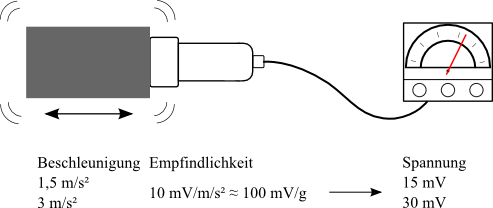 Die Empfindlichkeit besitzt die Einheit mV/m/s² oder auch mV/g. Beide genannten Einheiten liegen etwa um den Faktor 10 auseinander, auch wenn sie die gleiche Empfindlichkeit beschreiben, denn es gilt: