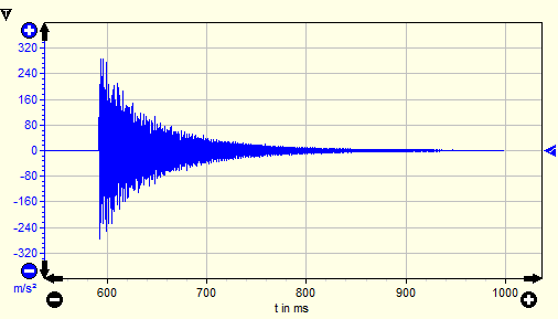 Der Beschleunigungsaufnehmer registriert eine mit der Zeit abnehmende Schwingung. Die Stahlplatte dämpft die Schwingungsamplituden.