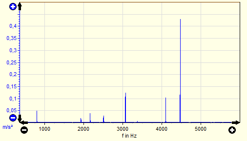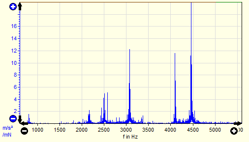 Ausschnitt aus dem Frequenzspektrum des Antwortsignals (Beschleunigungsaufnehmer). Es existieren deutlich sichtbare Frequenzlinien.