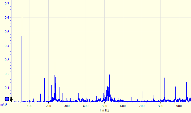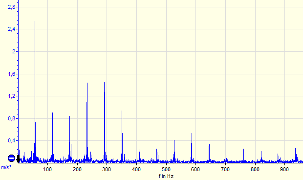 Eine Fouriertransformation des unbearbeiteten Signals zeigt dominierende Linien. Allerdings treten neben den Bauteilfrequenzen auch andere Störeinflüsse im Spektrum auf. Die Interpretation wird, insbesondere bei schwächer ausgebildeten Schäden, erschwert.