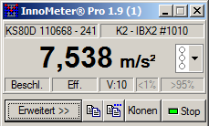 Cursoren lässt Rückschlüsse auf die hier zugrunde liegenden Mechanismen zu: Die auftretenden Stöße liegen 8,5 ms (118 Hz) bzw. 43,8 ms (23 Hz) auseinander. Die Käfigumlauffrequenz beträgt 22,6 Hz. Die zusätzliche Frequenz entspricht der Wälzkörperüberrollfrequenz 118 Hz.
