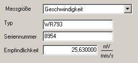 In den Sensoreinstellungen wird die Messgröße Geschwindigkeit gewählt und im Eingabefeld Empfindlichkeit der Übertragungsfaktor des Sensors hinterlegt.