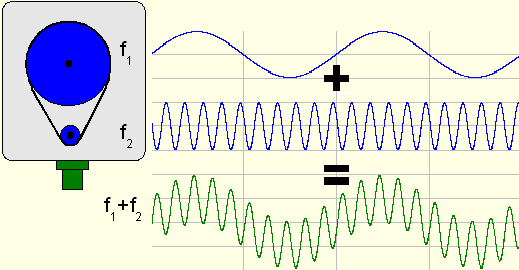 • Ein am Gehäuse angebrachter Sensor wird nun die Summe beider harmonischer Schwingungen messen.