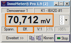 Sie sehen im linken VM-METER den eingestellten Betragsspitzen-Wert von 100mV und im rechten VM-METER den berechneten Effektivwert. Dieser wird mit 70,712 mV angegeben. Das ist der gerundete Wert von 100 mV geteilt durch die Wurzel der Zahl 2.