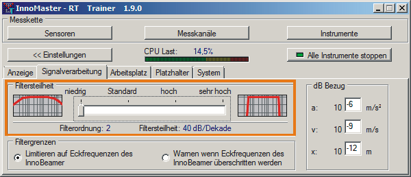 • Bestimmte Normen verlangen Filter mit einer bestimmten Steilheit, z.B. 40 dB/Dekade. Vorgegebene Grenzwerte für Messungen nach dieser Norm basieren auf diesen Einstellungen. Wenn Sie vergleichbar zur Norm messen wollen, dann sind gleiche Einstellungen notwendig