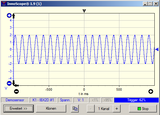 VM-SCOPE. Der Eingangsbereich des M302 / M312 liegt bei -10V ..+10V. Beim Start simulieren wir ein Signal mit einer Amplitude von 2000mV. Dieses liegt genau mitten im Messbereich. Es leuchtet keine Anzeige, alles ist in Ordnung.