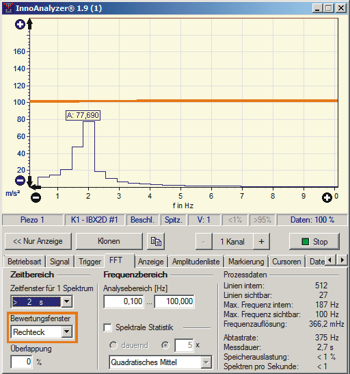 Als Fensterfunktion ist ein Rechteckfenster ausgewählt. Es ist ein deutliches Auftreten von Seitenbändern zu sehen sowie eine abgeschwächte Amplitude. Dem eingespeisten Signal entspricht rechnerisch eine Amplitude von 100 m/s², die FFT ermittelt aber nur 77,69 m/s². Der Leckeffekt tritt also auf.