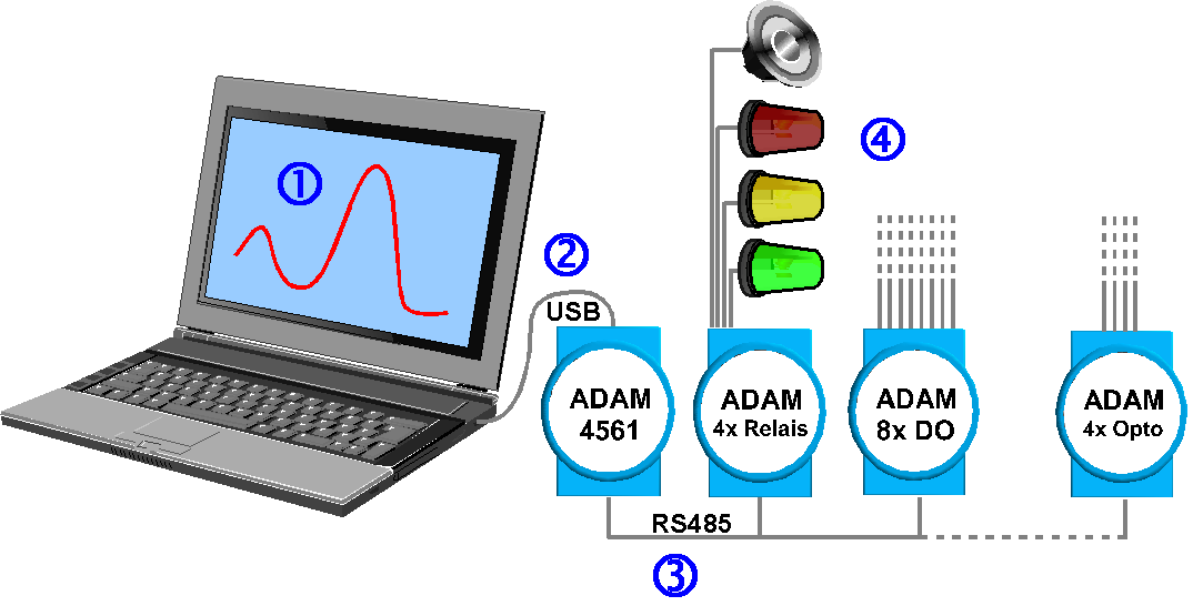 The measuring PC (1) is connected to a single converter type ADAM-4561 (2) via USB interface. It converts commands for the output modules of the ADAM network (3). Each ouput module contains several electrical switching outputs. Number and type of switching outputs differ depending on the type of output module. The switching outputs control annunciators or signal their state to other devices, e.g. controls or a PLC (4).