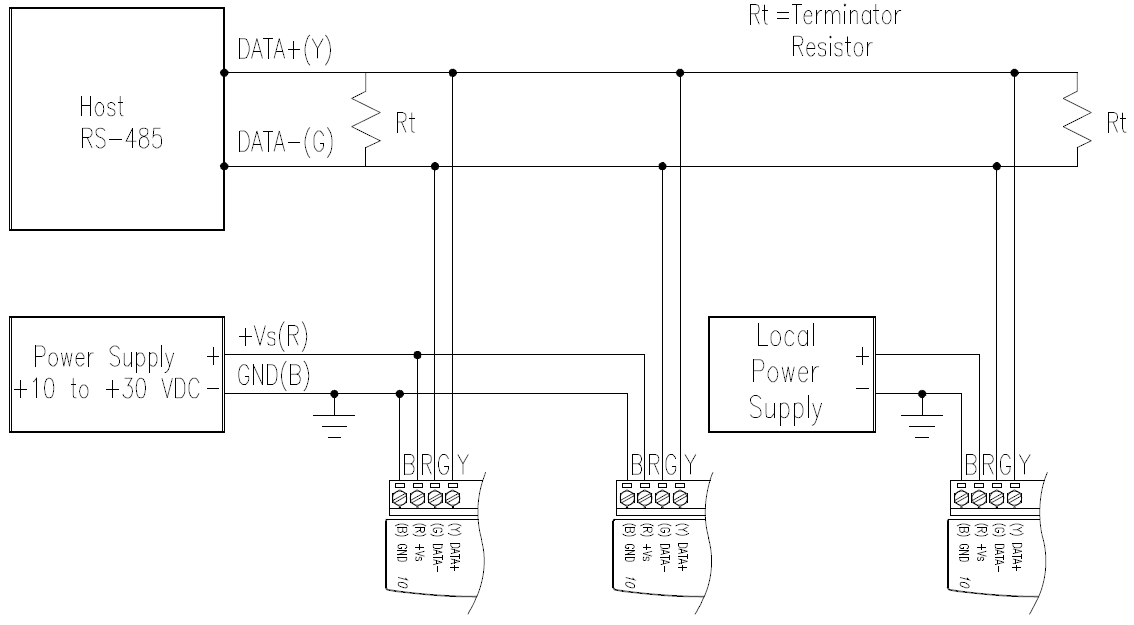 The RS485 standard is used for communication between the modules. Two terminals are required, the following colors are recommended for the wires: