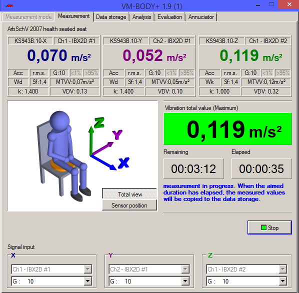 VM-BODY is applied for measuring human whole-body vibrations. Whole-body vibrations are caused by vibrations or shocks which are transmitted by machines and vehicles in the workplace via seat or feet. If a person is exposed to strong whole-body vibrations, safety and health are endangered and it is proven that backache can be provoked or aggravated.